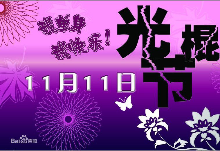 光棍节是一种流传于年轻人的娱乐性节日,以庆祝自己仍是单身一族为骄傲(“光棍”的意思便是“单身”)。11月11日,光棍节,源于这一天日期里有四个阿拉伯数字“1“形似四根光滑的棍子。