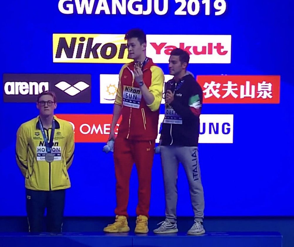 在2019年7月22日中国体育频道迎来了一大喜讯,在光州游泳世锦赛孙杨战胜了对手澳洲霍顿,夺得第一,实现了400米自由泳金牌四连冠的伟大成就。孙杨日积月累的付出无疑是艰辛的,在赛场上游出3分42秒44夺得金牌,取得的成果实乃当之无愧。而霍顿却在颁奖仪式上拒绝和孙杨领奖。做人要敢做敢当,不能因为一次失利未能超越别人而心生怨恨。