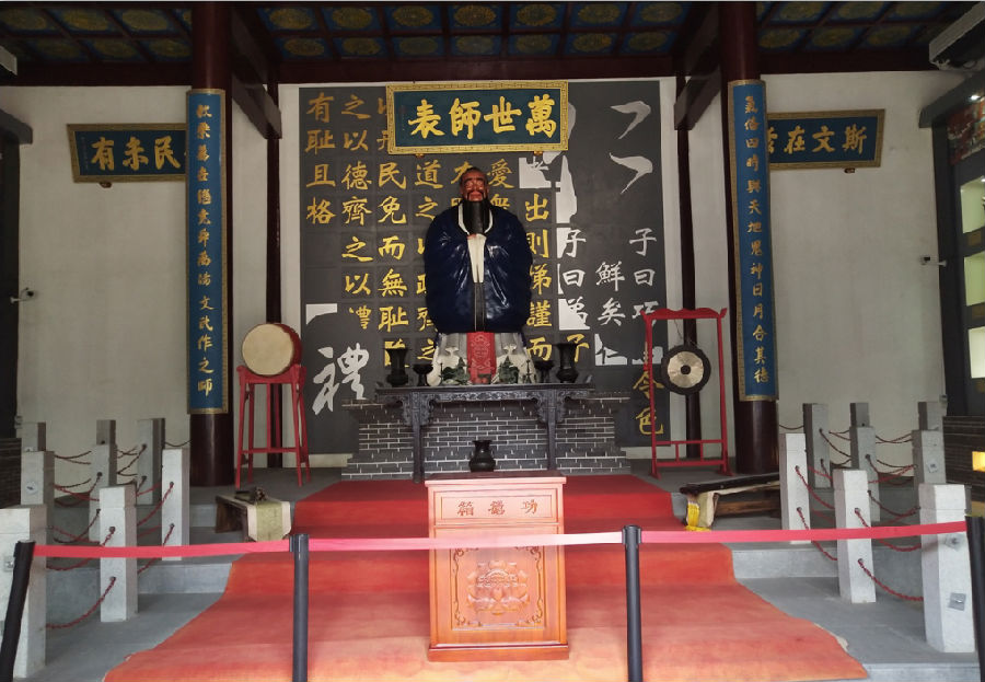 孔夫子庙伫立着一座巨大的孔子雕像。孔子作为万世师表和儒家学派的创始人,深受一代又一代人的敬重和仰慕。门下弟子三千,其中著名的72个弟子的雕像也被一一陈列在大殿中,并标有相关介绍。学生们相继跪拜了孔子雕像保佑自己学业有成。庙四周的墙壁上展示孔子的相关介绍以及孔子学院的分布介绍。孔子倡导仁、义、礼、智、信的思想,和及其弟子编纂的论语,对后人有着深远的影响,同时警醒学生们对思想和学习上的重视,教育学生拥有良好的行为道德,使他们受益终身。