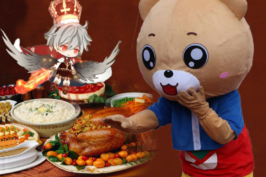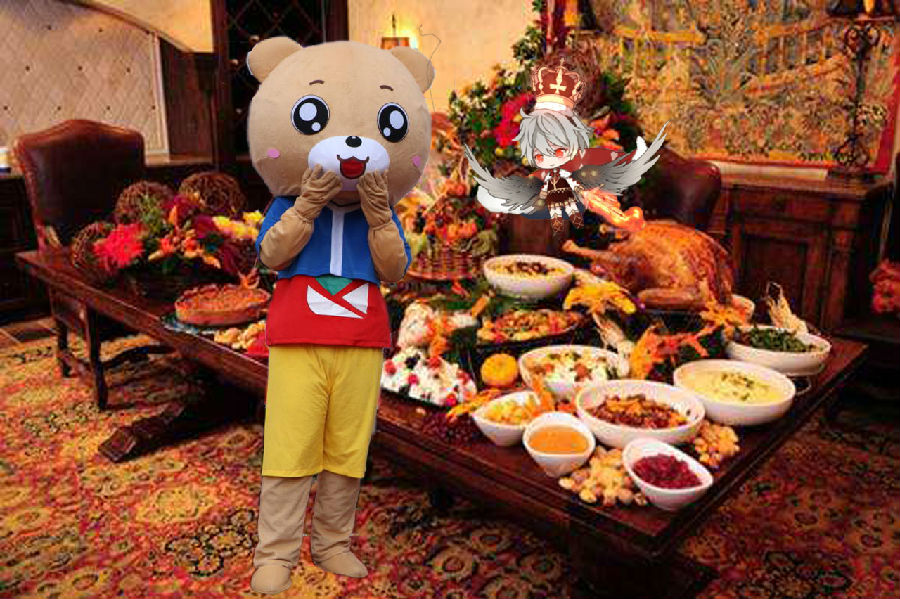 说话的功夫,熊熊熊已经吃完了半盘子的火鸡肉,舔了舔嘴,问火鸡,感恩节的传统食物火鸡是怎么做的,好好吃啊!熊熊熊眼睛闪着光亮问还有,除了火鸡,还有什么菜呢?面对熊熊熊的提问,火鸡自动代入是在夸自己,心情大好,干脆飞起来悬浮在切掉一些肉的烤火鸡上面。那你可问对人了,我就是火鸡之灵,可没有比我更加清楚的了!我可是要成为可靠的君王的人啊!火鸡自豪地大笑着,听好了,火鸡在烤制前会用各种香料进行腌制,整只烤制,鸡皮呈深棕色,肚子里还要塞上许多拌好的食物,如碎面包等。烤出的火鸡色泽金黄,鸡皮油润不开裂,鸡肉嫩滑。用刀切成薄片,浇卤汁、洒盐食用,味道那么鲜美当然是归功于优秀的香料和填塞进去的食物啊。如果想学的话我可以等会再教你。第二个问题,感恩节除了吃烤火鸡,还有三炙鸟,美式玉米面包等等,当然了,她们也来了。看,来了。