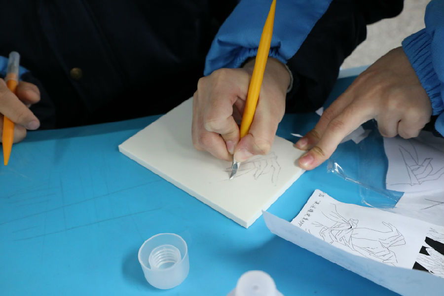 我选择了一个喜欢的图案,根据社长的做法,一步一步的慢慢雕刻,生怕中间出现差错以至于前功尽弃。最后,在我的不懈努力下,终于制作出了属于自己的印章。