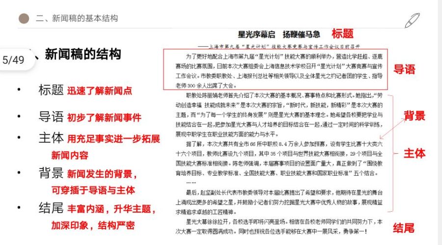 通讯稿的结构写作为这次会议的主要内容。它的定义为:写人纪事,全面生动地反映新闻现象。其内容分布为标题、导语、背景、主题及结尾。而标题又分为引题、主题和副题,因为标题是整个文章的文眼,所以引题是交代背景、揭示意义、烘托气氛等。