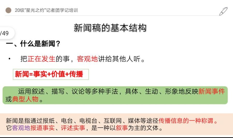 在此之后,张诗祺对通讯稿进行了归纳与总结重点内容:通讯稿语言最为注意,要有理性、感性、精炼的特点,在写作中可追求形象化,进行打开五官的感受,也可以事因人生,有自己的语言风格。强调在新闻的写作中要格外注意自我代入,口语化和病句的问题,要做到多读、多写、多改。