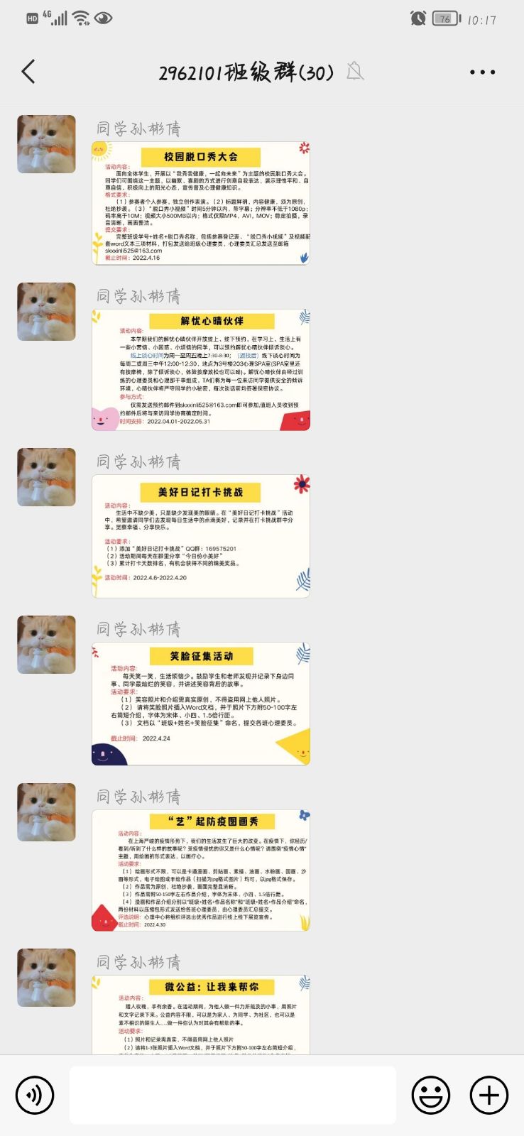 提到了一天的生活可以劳动结合,上课时尽量认真听讲,下课后可以放松。由于现在是网课,所以说我们有很多多余充足的时间可以去做自己想要的做事情,来进一步更好的完善自己,同时学校也考虑到了这一点。学校发布了各种活动,比如画画,脱口秀,文艺类的等等。比较全面多样化,让我们生活中不再那么枯燥,所以相对来说同学们还是比较积极的在参加。特此心理课代表同学还为我们做到了PPT上也进行了一番讲解。