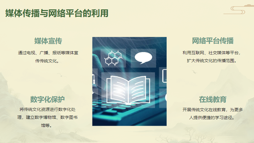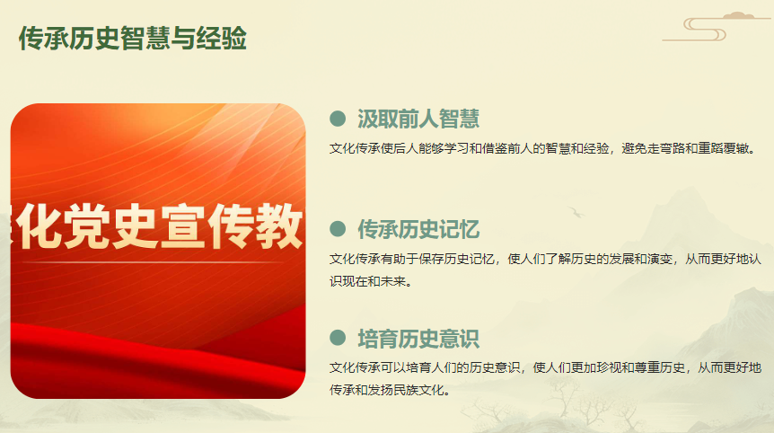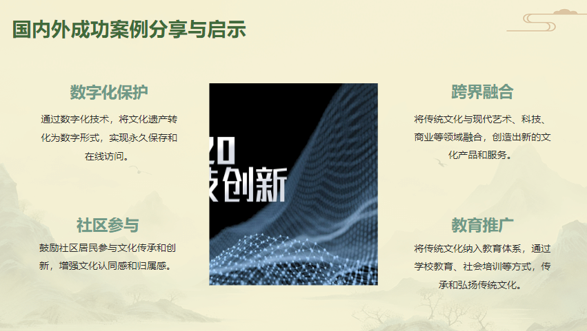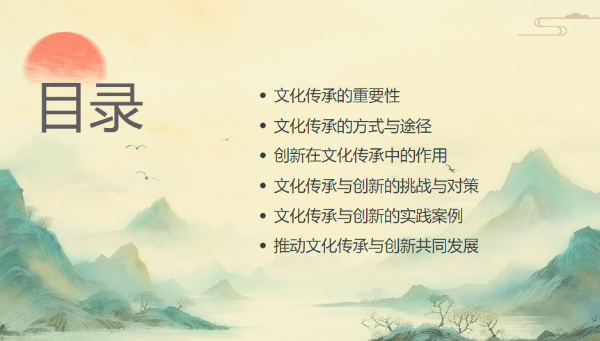 "在时光的长河中,文化传承是根,创新是魂。让我们珍视每一份历史遗留下的智慧结晶,用现代科技与创新思维为其注入新的话力。在传承中不忘探索,在创新中不失根本。让古老的文化在新时代绽放异彩,成为连接过去与未来的桥梁。携手并进,让文化传承与创新的光芒照亮人类前行的道路,共创辉煌的文化新篇章!”