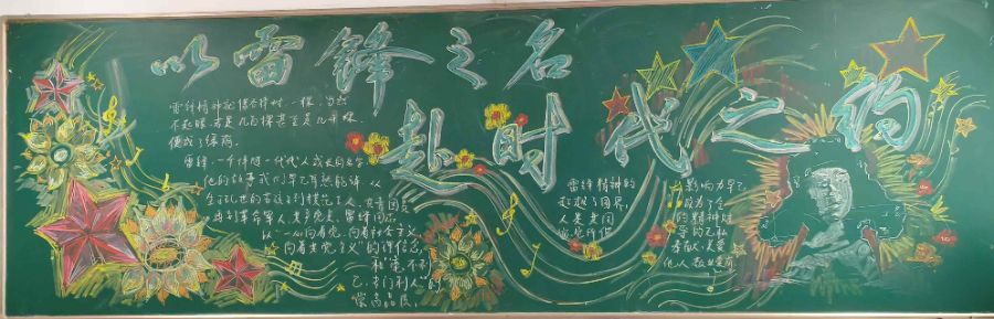 板报整体布局大气磅礴,主标题采用飘逸灵动的艺术字体,苍劲有力,占据视觉中心。标题两侧以五角星、繁花与流动的彩带为主要装饰元素,色彩丰富绚丽,既有红色的热烈,又有金色的璀璨,象征着雷锋精神如星辰般闪耀,如繁花般绽放。