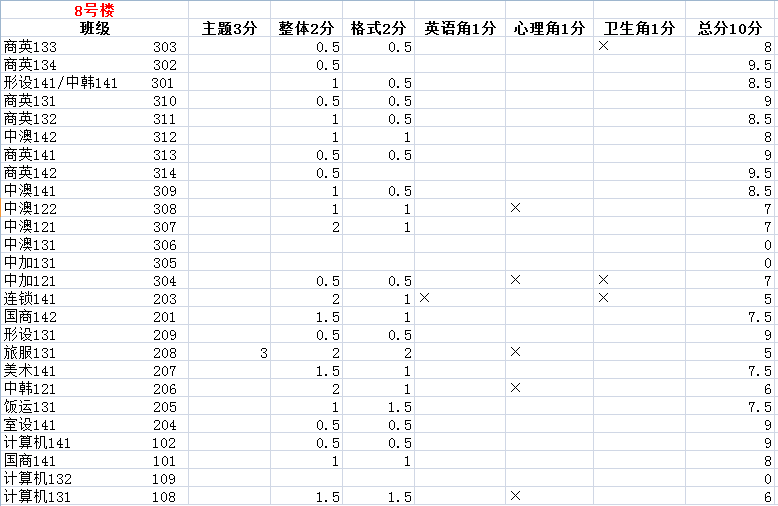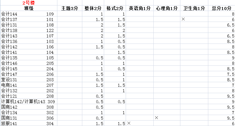 现在,将黑板报评比结果如下公布: