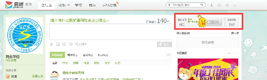 请各班易班班长每月28日-30日之间,将自己易班页面右上角的签到的天数上报到本帖子,学期结束考核优秀易班班长时将采纳此项内容,回帖格式如下,