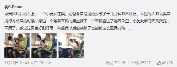 微博一名用户昨日上载几张温馨照片,指一名小女孩在往深圳的火车上哭起来,她爸爸也非常尴尬,安慰了10多分钟也不成功,车里的人都被哭声弄得烦躁起来。这时候,坐在她旁边一名戴着耳机的男生,突然把一边耳机摘下,塞进她耳朵里,小女孩瞬间安静起来。