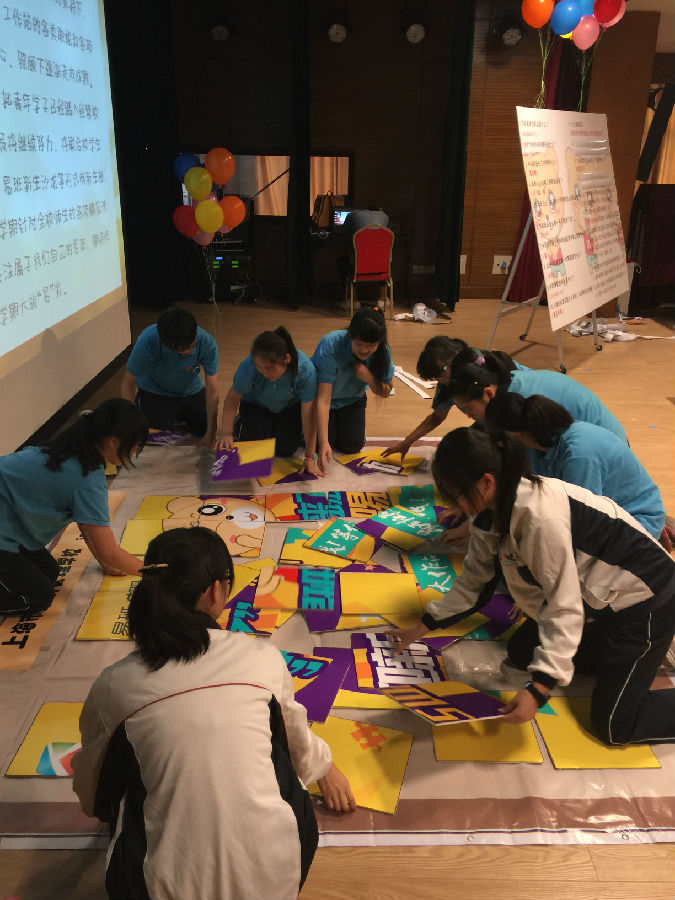 在问答环节结束后,本次游园活动的最高潮部分终于到来了!10位同学组成小组上台拼图,由工作人员进行计时,最终成绩将其他学校进行比拼。在同学们的共同努力下,我校本次易班熊拼图战的成绩是:301″,暂列校际第一名!