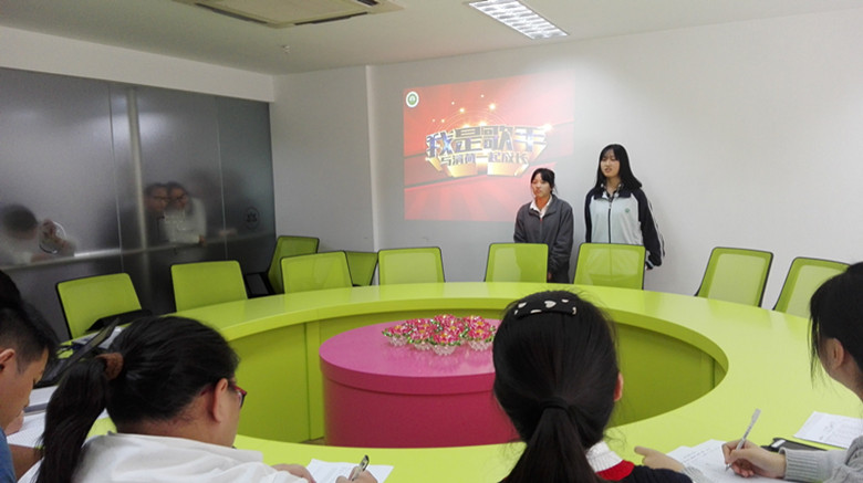 由林樑老师以及四位15级易班工作站成员组成的评委席早早进入了比赛场地静候比赛,不难看出有些许紧张。14级易班干事早早在候场区安排好一切事物,一切准备就绪,比赛开始!每位歌手的倾情演唱都让我们陶醉,评委根据形象,音准,节奏感,表现力四个方面进行综合评分。评委与他们偶尔一个眼神的交际,都能发现他们的与众不同,在他们的身上,我们看到了执着的那份对歌唱的热爱,我们需要的不是天籁,而是真情。